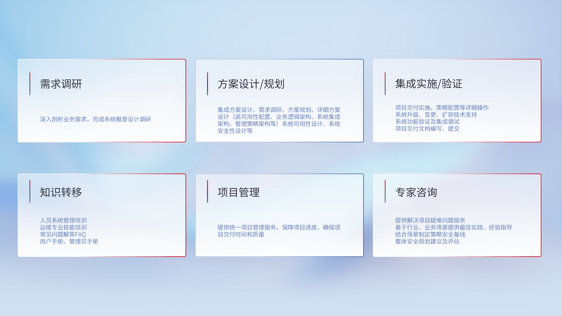 针对客户行业特性,,,,将宏观的安全战略和需求,,通过专业的交付服务,,,,实现项目落地,,,,为客户提供标准规范的集成交付服务。。。。